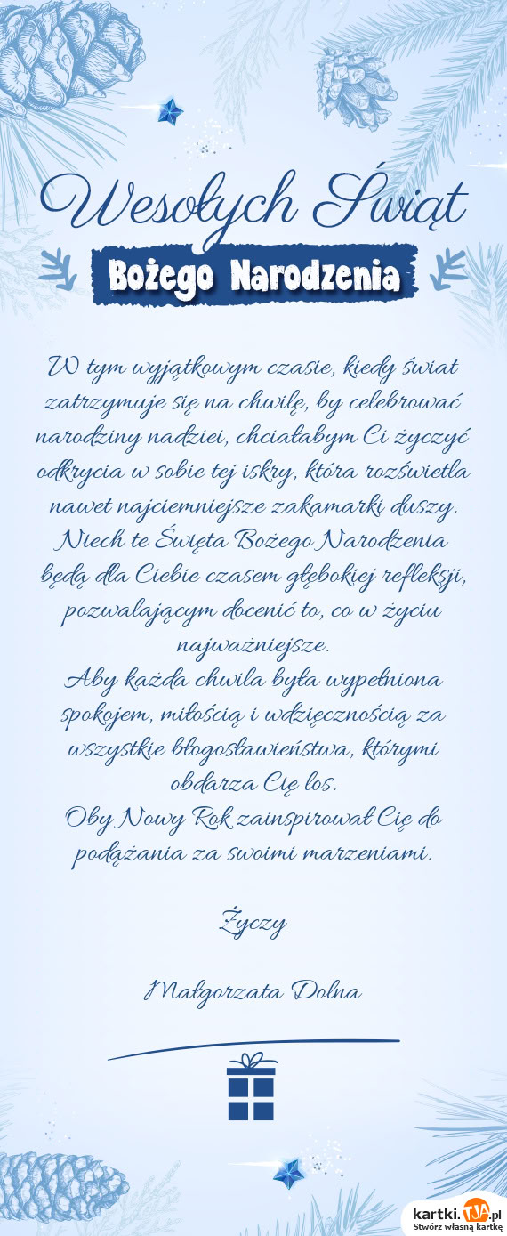 W tym wyjątkowym czasie, kiedy świat zatrzymuje się na chwilę, by celebrować narodziny nadziei, chciałabym Ci życzyć odkrycia w sobie tej iskry, która rozświetla nawet najciemniejsze zakamarki duszy.