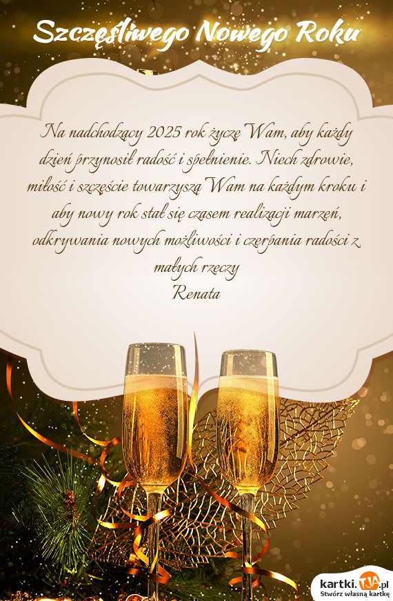 Na nadchodzący 2025 rok życzę Wam, aby każdy dzień przynosił radość i spełnienie. Niech zdrowie, miłość i szczęście towarzyszą Wam na każdym kroku i aby nowy rok stał się czasem realizacji marzeń, odkrywania nowych możliwości i czerpania radości z małych rzeczy