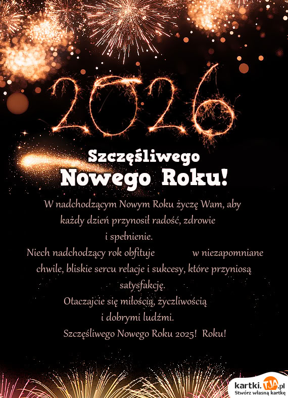 Niech nadchodzący rok obfituje w niezapomniane chwile, bliskie sercu relacje i sukcesy, które przyniosą satysfakcję.