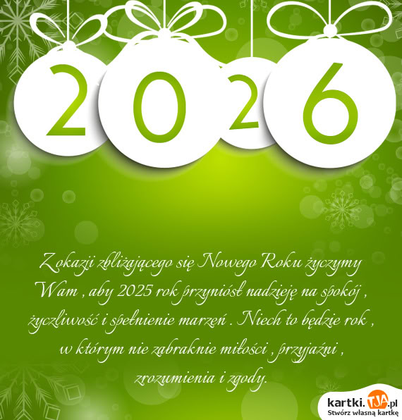 Z okazji zbliżającego się Nowego Roku życzymy Wam , aby 2025 rok przyniósł nadzieję na spokój , życzliwość i spełnienie marzeń . Niech to będzie rok , w którym nie zabraknie miłości , przyjaźni , zrozumienia i zgody.