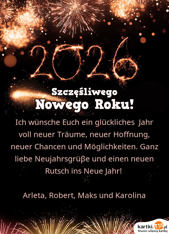 Ich wünsche Euch ein glückliches Jahr voll neuer Träume, neuer Hoffnung, neuer Chancen und Möglichkeiten. Ganz liebe Neujahrsgrüβe und einen neuen Rutsch ins Neue Jahr!
