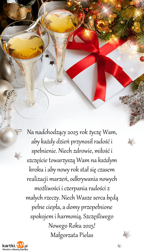 Na nadchodzący 2025 rok życzę Wam, aby każdy dzień przynosił radość i spełnienie. Niech zdrowie, miłość i szczęście towarzyszą Wam na każdym kroku i aby nowy rok stał się czasem realizacji marzeń, odkrywania nowych możliwości i czerpania radości z małych rzeczy. Niech Wasze serca będą pełne ciepła, a domy przepełnione spokojem i harmonią. Szczęśliwego Nowego Roku 2025!