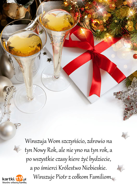 Winszuja Wom szczyńścio, zdrowio na tyn Nowy Rok, ale nie yno na tyn rok, a po wszystkie czasy kiere żyć bydziecie, a po śmierci Królestwo Niebieskie.