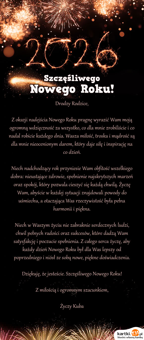 Z okazji nadejścia Nowego Roku pragnę wyrazić Wam moją ogromną wdzięczność za wszystko, co dla mnie zrobiliście i co nadal robicie każdego dnia. Wasza miłość, troska i mądrość są dla mnie nieocenionym darem, który daje siłę i inspirację na co dzień.