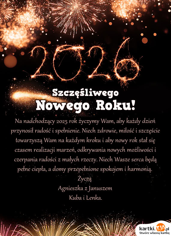 Na nadchodzący 2025 rok życzymy Wam, aby każdy dzień przynosił radość i spełnienie. Niech zdrowie, miłość i szczęście towarzyszą Wam na każdym kroku i aby nowy rok stał się czasem realizacji marzeń, odkrywania nowych możliwości i czerpania radości z małych rzeczy. Niech Wasze serca będą pełne ciepła, a domy przepełnione spokojem i harmonią.