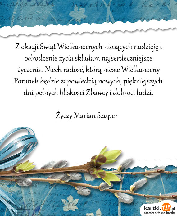 Z okazji Świąt Wielkanocnych niosących nadzieję i odrodzenie życia składam najserdeczniejsze życzenia. Niech radość, którą niesie Wielkanocny Poranek będzie zapowiedzią nowych, piękniejszych dni pełnych bliskości Zbawcy i dobroci ludzi.