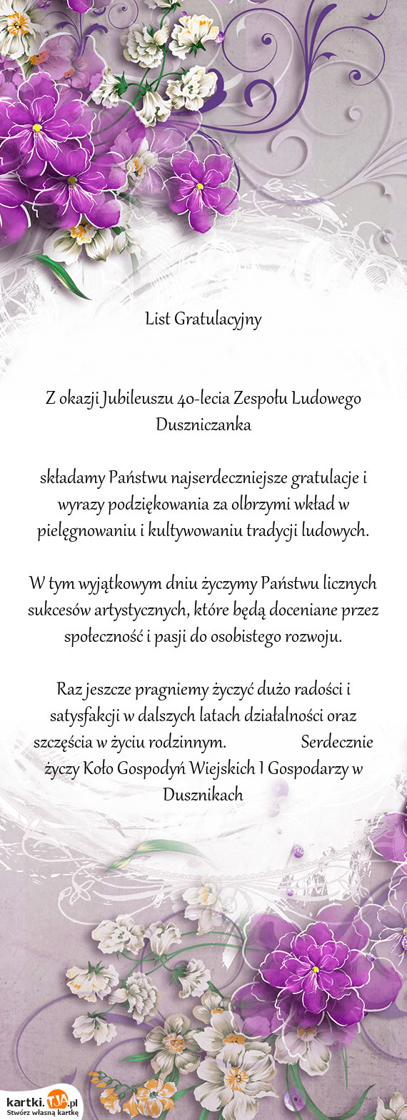 Raz jeszcze pragniemy życzyć dużo radości i satysfakcji w dalszych latach działalności oraz szczęścia w życiu rodzinnym. Serdecznie życzy Koło Gospodyń Wiejskich I Gospodarzy w Dusznikach