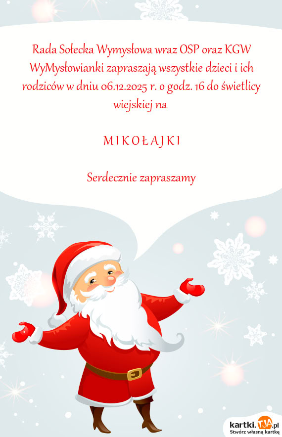 Rada Sołecka Wymysłowa wraz OSP oraz KGW WyMysłowianki zapraszają wszystkie dzieci i ich rodziców w dniu 06.12.2025 r. o godz. 16 do świetlicy wiejskiej na