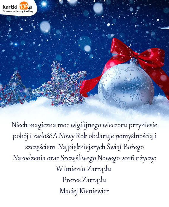 Niech magiczna moc wigilijnego wieczoru przyniesie pokój i radość A Nowy Rok obdaruje pomyślnością i szczęściem. Najpiękniejszych Świąt Bożego Narodzenia oraz Szczęśliwego Nowego 2026 r życzy: