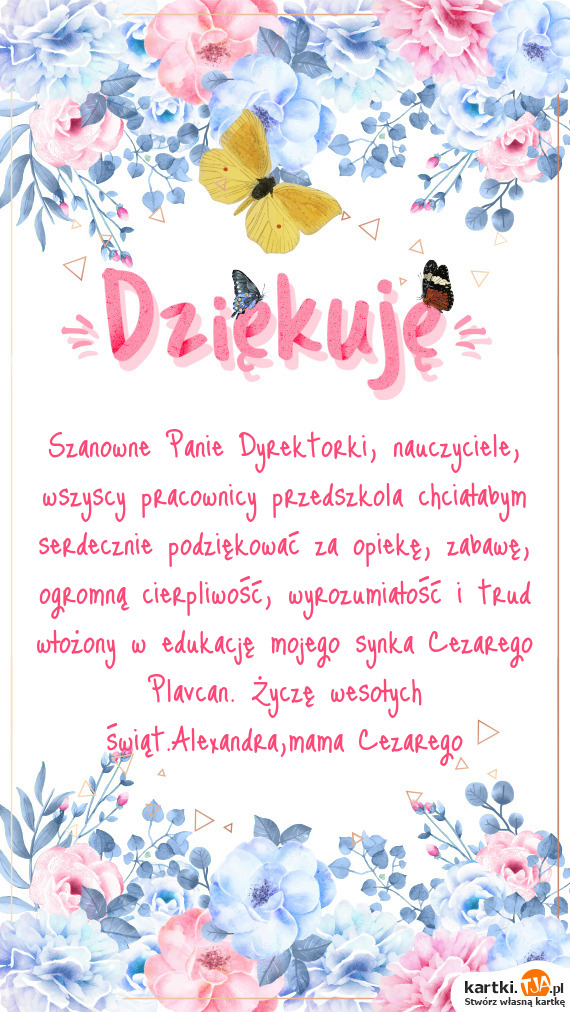 Szanowne Panie Dyrektorki, nauczyciele, wszyscy pracownicy przedszkola chciałabym serdecznie podziękować za opiekę, zabawę, ogromną cierpliwość, wyrozumiałość i trud włożony w edukację mojego synka Cezarego Plavcan. Życzę wesołych świąt.Alexandra,mama Cezarego