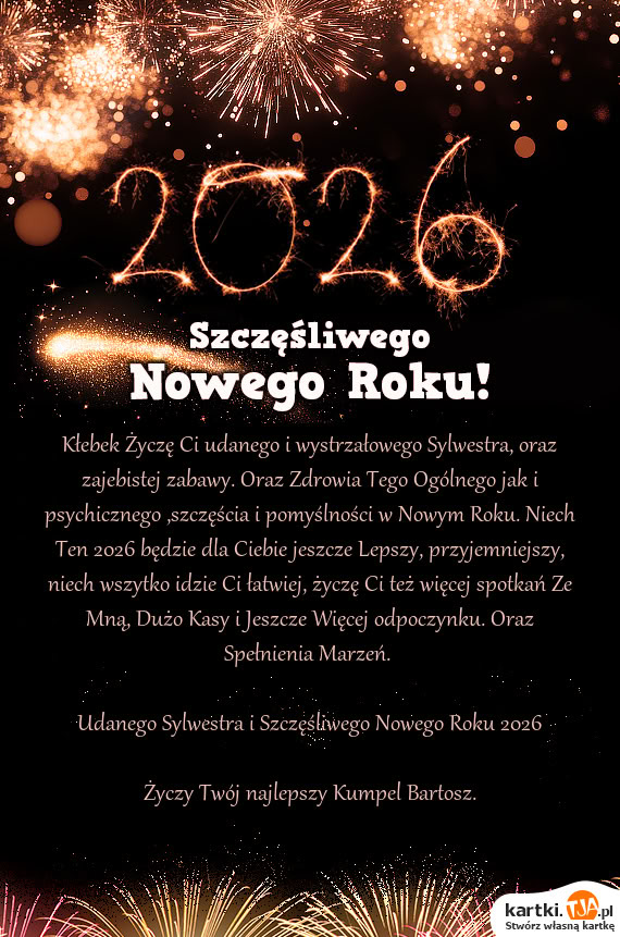 Kłebek Życzę Ci udanego i wystrzałowego Sylwestra, oraz zajebistej zabawy. Oraz Zdrowia Tego Ogólnego jak i psychicznego ,szczęścia i pomyślności w Nowym Roku. Niech Ten 2026 będzie dla Ciebie jeszcze Lepszy, przyjemniejszy, niech wszytko idzie Ci łatwiej, życzę Ci też więcej spotkań Ze Mną, Dużo Kasy i Jeszcze Więcej odpoczynku. Oraz Spełnienia Marzeń.