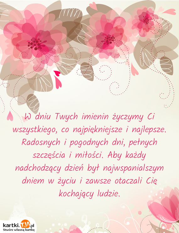 W dniu Twych imienin życzymy Ci wszystkiego, co najpiękniejsze i najlepsze. Radosnych i pogodnych dni, pełnych szczęścia i miłości. Aby każdy nadchodzący dzień był najwspanialszym dniem w życiu i zawsze otaczali Cię kochający ludzie.