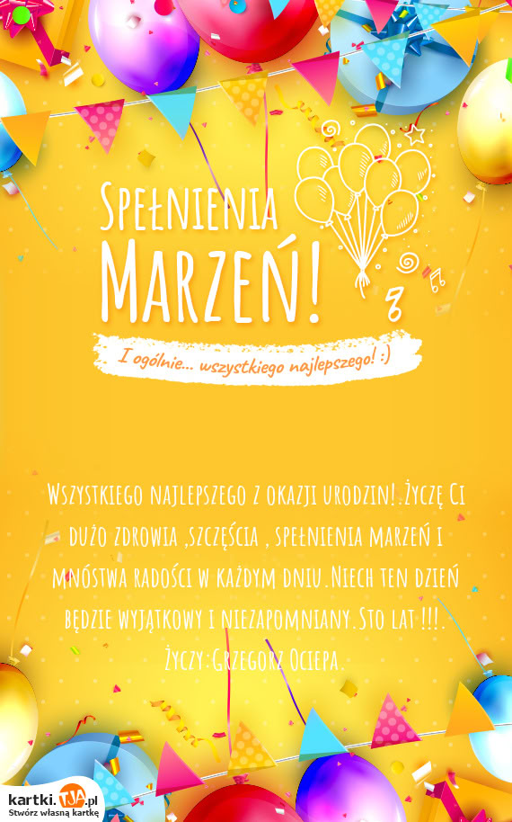 Wszystkiego najlepszego z okazji urodzin!.Życzę Ci dużo zdrowia ,szczęścia , spełnienia marzeń i mnóstwa radości w każdym dniu.Niech ten dzień będzie wyjątkowy i niezapomniany.Sto lat !!!. Życzy:Grzegorz Ociepa.
