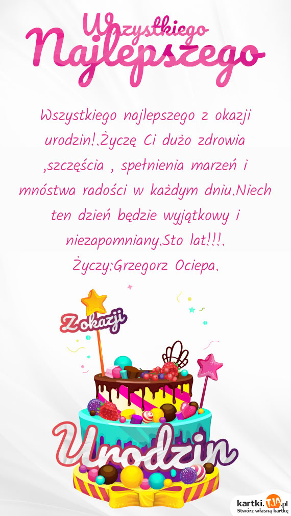 Wszystkiego najlepszego z okazji urodzin!.Życzę Ci dużo zdrowia ,szczęścia , spełnienia marzeń i mnóstwa radości w każdym dniu.Niech ten dzień będzie wyjątkowy i niezapomniany.Sto lat!!!. Życzy:Grzegorz Ociepa.