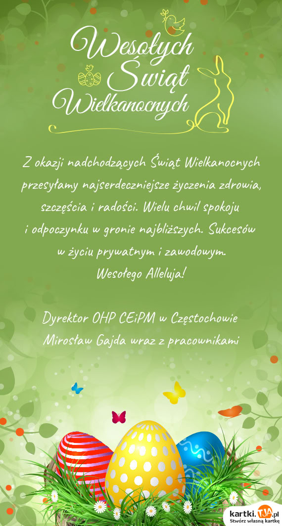 Z okazji nadchodzących Świąt Wielkanocnych przesyłamy najserdeczniejsze życzenia zdrowia, szczęścia i radości. Wielu chwil spokoju