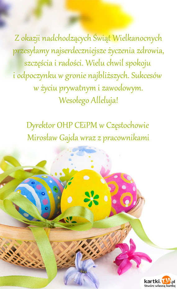 Z okazji nadchodzących Świąt Wielkanocnych przesyłamy najserdeczniejsze życzenia zdrowia, szczęścia i radości. Wielu chwil spokoju