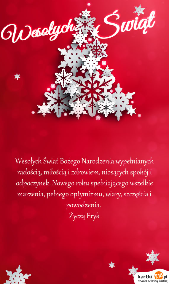 Wesołych Świat Bożego Narodzenia wypełnianych radością, miłością i zdrowiem, niosących spokój i odpoczynek. Nowego roku spełniającego wszelkie marzenia, pełnego optymizmu, wiary, szczęścia i powodzenia.