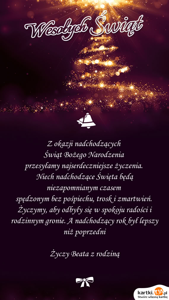 Życzymy, aby odbyły się w spokoju radości i rodzinnym gronie. A nadchodzący rok był lepszy niż poprzedni