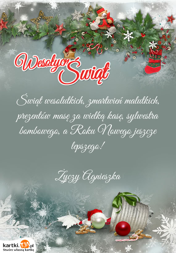 Świąt wesolutkich, zmartwień malutkich, prezentów masę za wielką kasę, sylwestra bombowego, a Roku Nowego jeszcze lepszego!