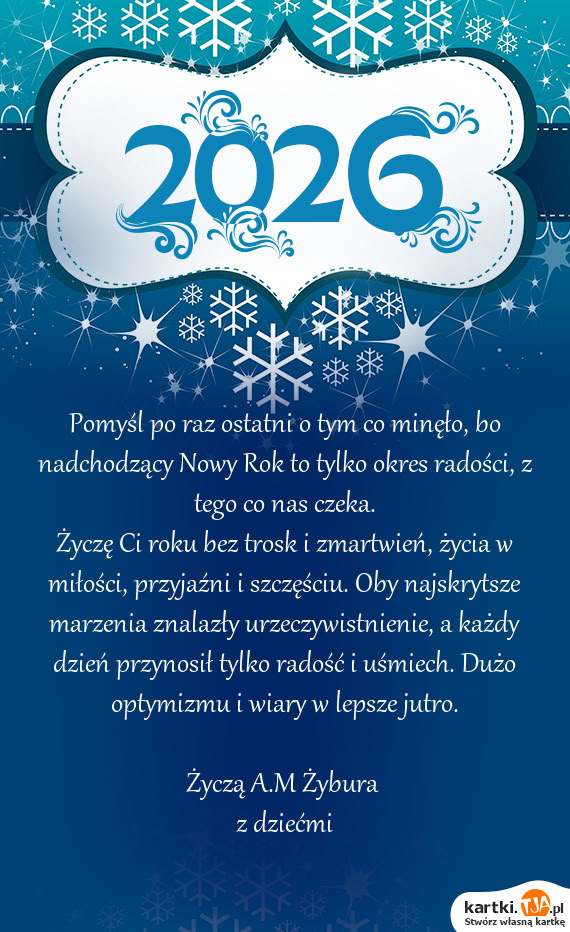 Życzę Ci roku bez trosk i zmartwień, życia w miłości, przyjaźni i szczęściu. Oby najskrytsze marzenia znalazły urzeczywistnienie, a każdy dzień przynosił tylko radość i uśmiech. Dużo optymizmu i wiary w lepsze jutro.
