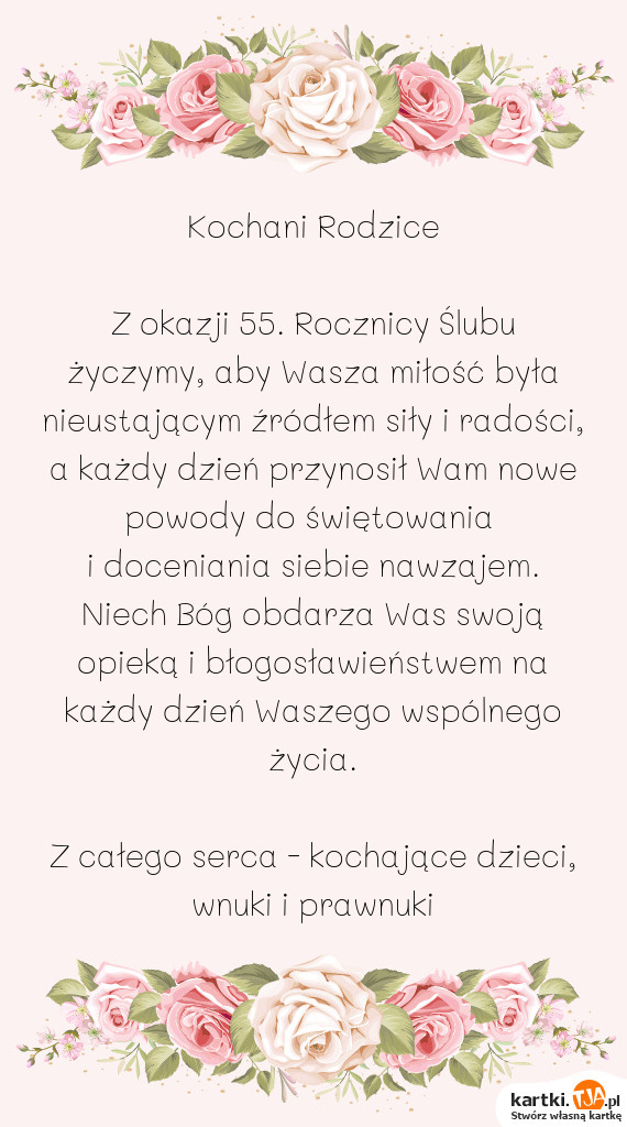 Z okazji 55. Rocznicy Ślubu życzymy, aby Wasza miłość była nieustającym źródłem siły i radości, a każdy dzień przynosił Wam nowe powody do świętowania