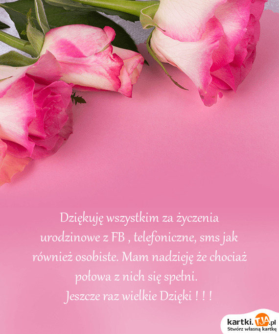 Dziękuję wszystkim za życzenia urodzinowe z FB , telefoniczne, sms jak również osobiste. Mam nadzieję że chociaż połowa z nich się spełni.