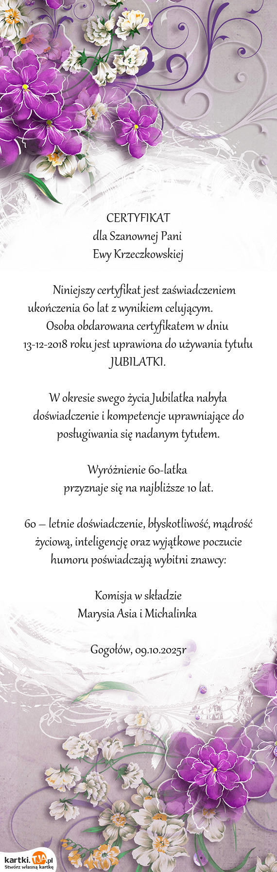 Niniejszy certyfikat jest zaświadczeniem ukończenia 60 lat z wynikiem celującym.