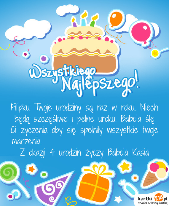 Filipku Twoje urodziny są raz w roku. Niech będą szczęśliwe i pełne uroku. Babcia ślę Ci zyczenia oby się spełniły wszystkie twoje marzenia. Z okazji 4 urodzin życzy Babcia Kasia