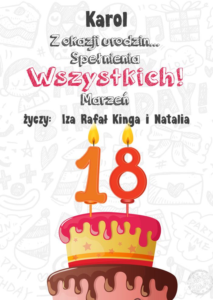 Karol Kartka z okazji 18 urodzin, życzy: Iza Rafał Kinga i Natalia