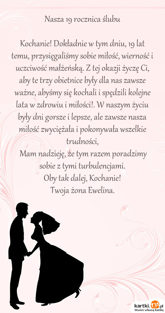Kochanie! Dokładnie w tym dniu, 19 lat temu, przysięgaliśmy sobie miłość, wierność i uczciwość małżeńską. Z tej okazji życzę Ci, aby te trzy obietnice były dla nas zawsze ważne, abyśmy się kochali i spędzili kolejne lata w zdrowiu i miłości!. W naszym życiu były dni gorsze i lepsze, ale zawsze nasza miłość zwyciężała i pokonywała wszelkie trudności,
