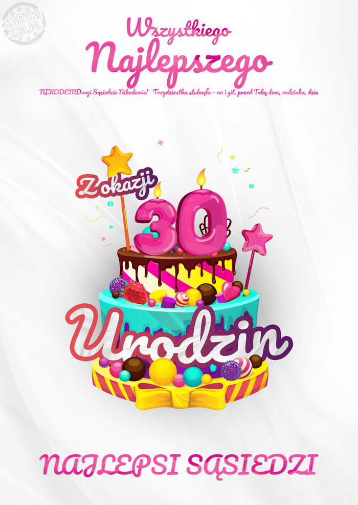 NIKODEMDrogi Sąsiedzie Nikodemie! 🎉 Trzydziestka stuknęła – no i git, przed Tobą dom, rodzinka, dzieci – full wypas, nie kit! 🏡👶 Niech zdrowie dopisuje, portfel się nie kurczy, a budowa idzie sprawnie – bez przekleństw i bez murczy! 🔨😂 Wszystkiego najlepszego, samych fajnych chwil, od sąsiadów, co zawsze pomogą (i z grilla dorzucą szynki, choćby na pół kilo)! 🍖🍺 Najlepsze życzenia od sąsiadów! , Wszystkiego najlepszego z okazji 30 urodzin NAJLEPSI SĄSIEDZI