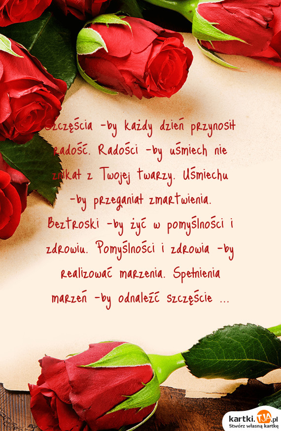 Szczęścia -by każdy dzień przynosił radość. Radości -by uśmiech nie znikał z Twojej twarzy. Uśmiechu -by przeganiał zmartwienia. Beztroski -by żyć w pomyślności i zdrowiu. Pomyślności i zdrowia -by realizować marzenia. Spełnienia marzeń -by odnaleźć szczęście ...