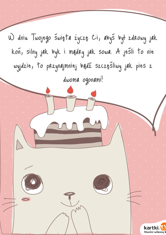 W dniu Twojego święta życzę Ci, abyś był zdrowy jak koń, silny jak byk i mądry jak sowa. A jeśli to nie wyjdzie, to przynajmniej bądź szczęśliwy jak pies z dwoma ogonami!
