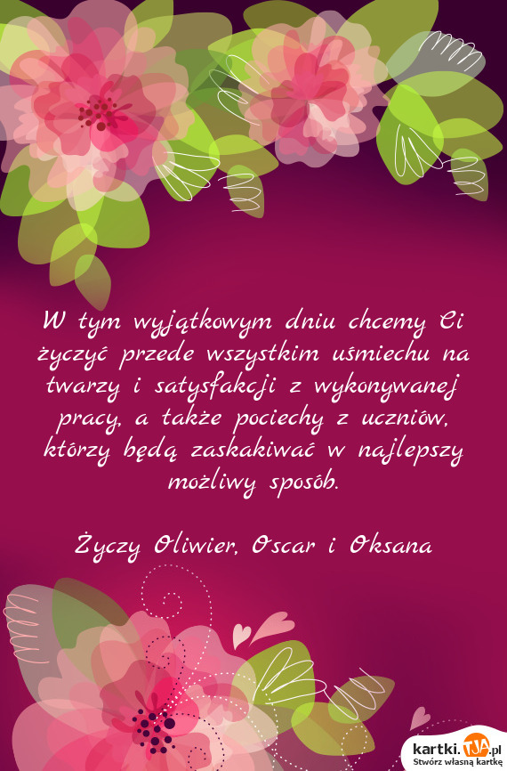 W tym wyjątkowym dniu chcemy Ci życzyć przede wszystkim uśmiechu na twarzy i satysfakcji z wykonywanej pracy, a także pociechy z uczniów, którzy będą zaskakiwać w najlepszy możliwy sposób.