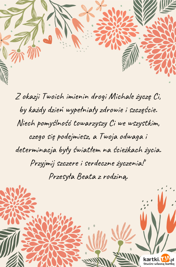 Z okazji Twoich imienin drogi Michale życzę Ci, by każdy dzień wypełniały zdrowie i szczęście. Niech pomyślność towarzyszy Ci we wszystkim, czego się podejmiesz, a Twoja odwaga i determinacja były światłem na ścieżkach życia. Przyjmij szczere i serdeczne życzenia!”