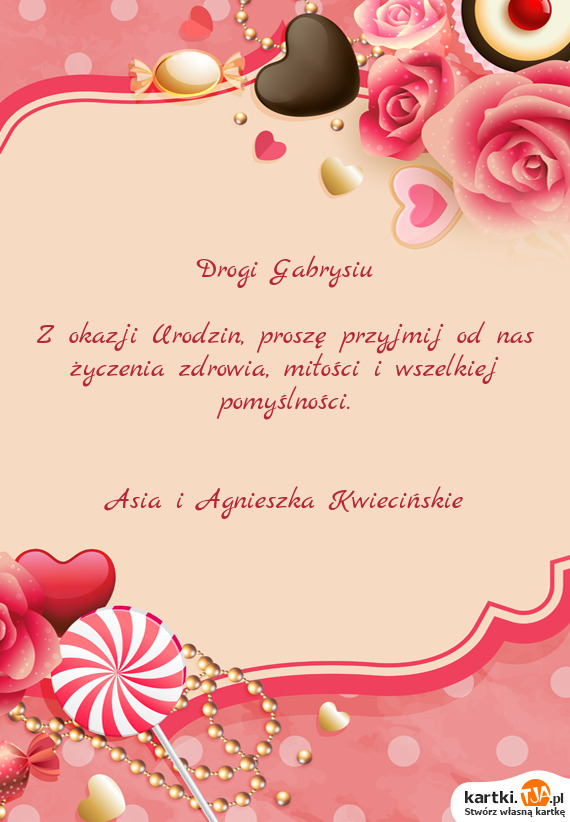 Z okazji Urodzin, proszę przyjmij od nas życzenia zdrowia, miłości i wszelkiej pomyślności.