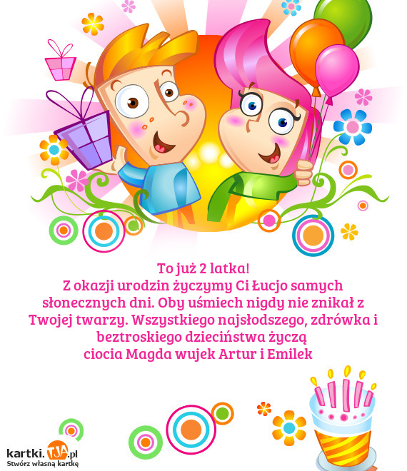 Z okazji urodzin życzymy Ci Łucjo samych słonecznych dni. Oby uśmiech nigdy nie znikał z Twojej twarzy. Wszystkiego najsłodszego, zdrówka i beztroskiego dzieciństwa życzą