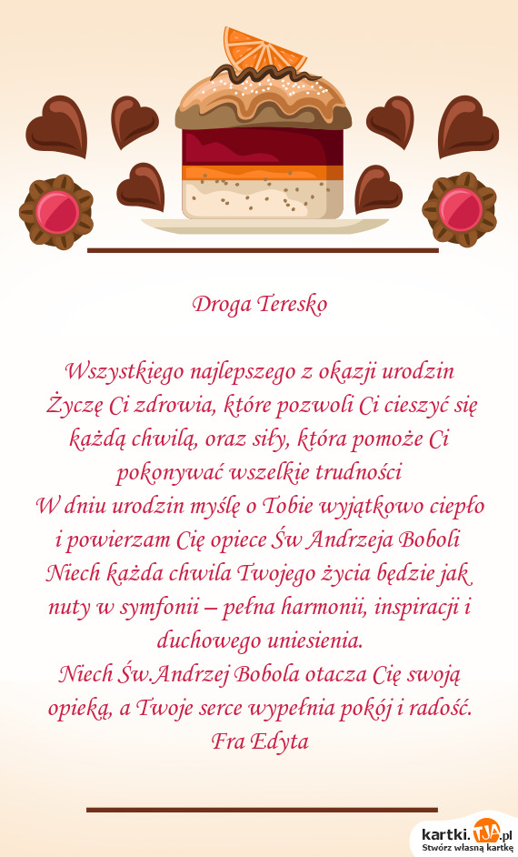 W dniu urodzin myślę o Tobie wyjątkowo ciepło i powierzam Cię opiece Św Andrzeja Boboli