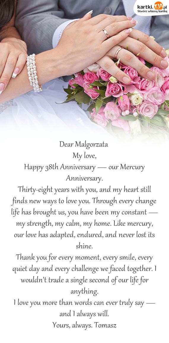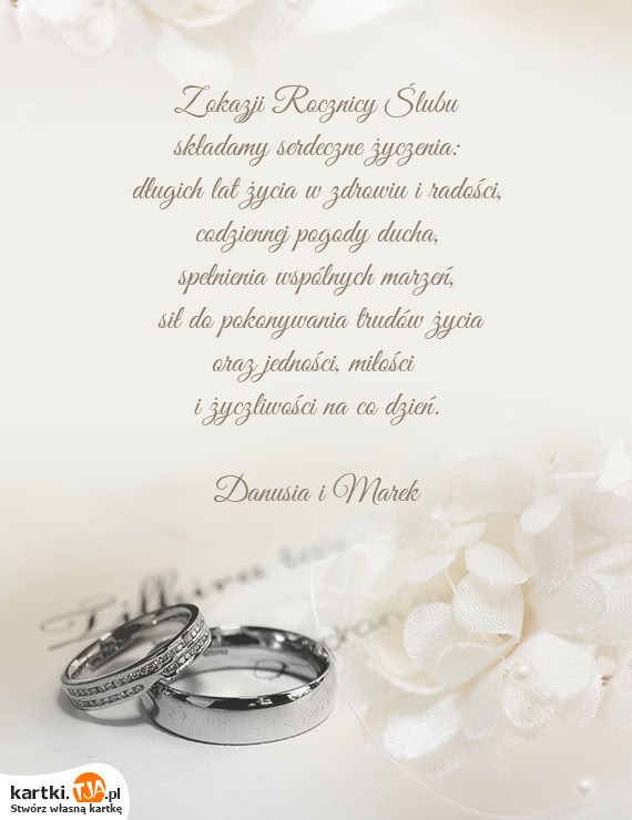 A co potem? Dalej jest jeszcze prościej ? po prostu podpisz się pod zaproponowanymi życzeniami ślubnymi, a wygenerowaną kartkę udostępnij na Facebooku, wyślij mailem lub przez Gadu-Gadu albo zapisz, wydrukuj i wręcz nowożeńcom osobiście!